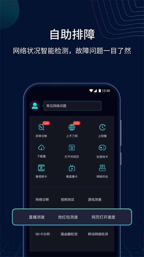 4、网络分析:智能分析当前网络状况,如IP、信号、带宽、延迟、下载、上传和其他数据。