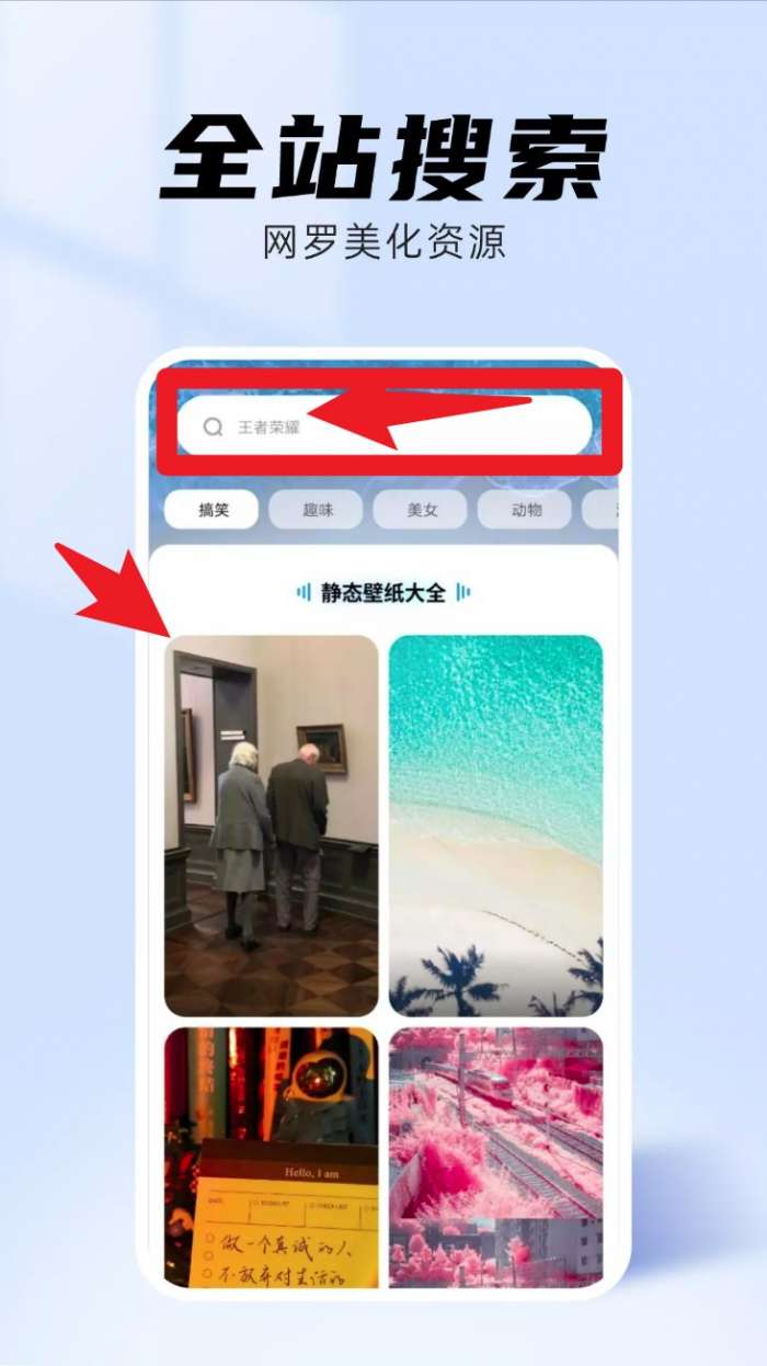 2、点击顶部搜索框输入关键词(如“王者荣耀”),系统将根据全站资源自动推荐相关高清壁纸内容。