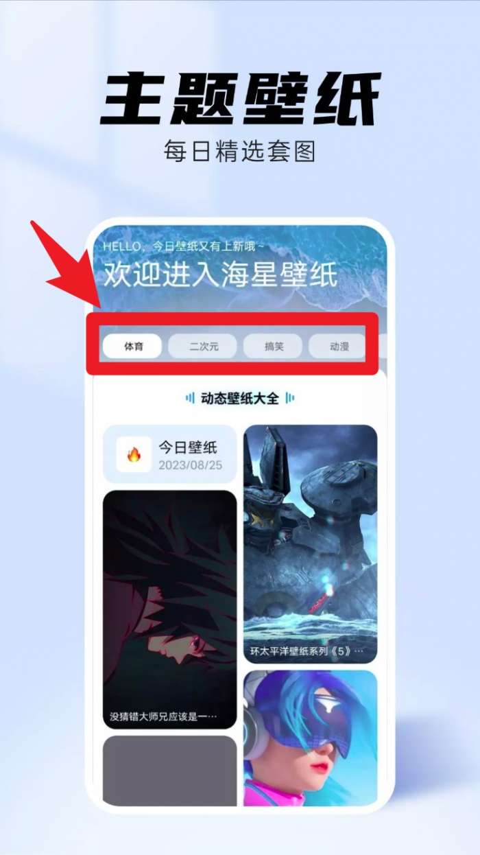 1、打开海星壁纸App后,会自动进入首页主题壁纸专区,点击上方标签栏可快速切换分类,如“体育”“二次元”等类型。
