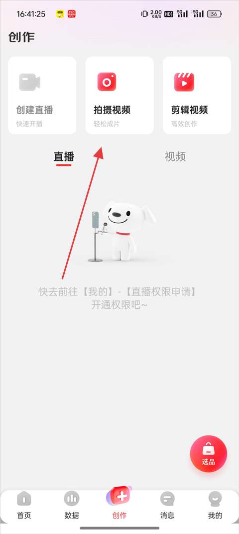 1、下载并打开京东内容助手App,在首页点击底部的【创作】按钮;