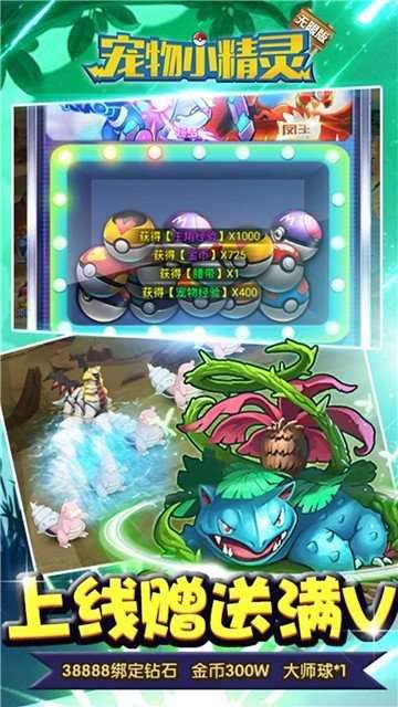 1、上线直接送满级VIP18、38888绑定钻石、金币300W,大师球*1,在野外遇到喜欢的精灵,想抓就抓。