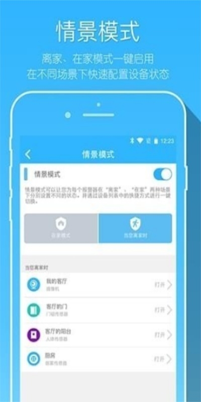 情景模式:离家、在家模式一键启用,在不同场景下快速配置设备状态