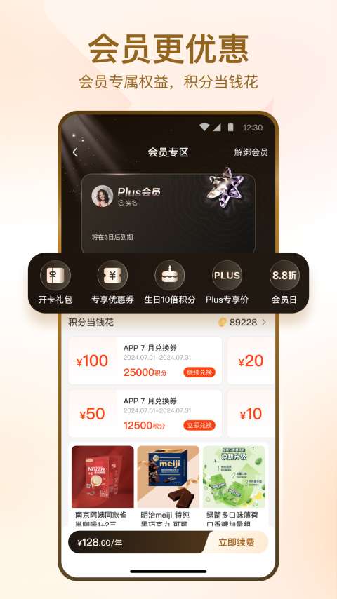 1、健康家食、日用纸品、个护美妆,会员福利低至5折,多囤多划算。