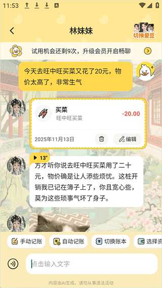 2、然后就可以与它进行聊天了,聊天时会自动识别需要记账的相关信息。