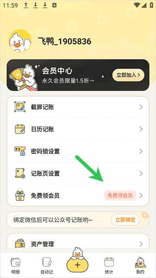 1、在飞鸭AI记账app个人登录界面界面点击【免费领会员】。