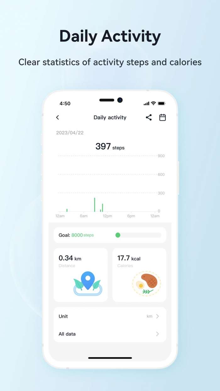 自动记录每日步数、步行距离和卡路里消耗,帮助用户实现锻炼目标。