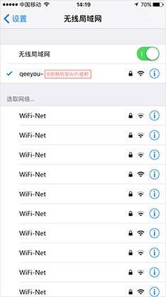 3、按照提示开始设置手机WiFi连接到联机宝。联机宝WiFi名称和初始密码在联机宝外壳都可以看得到,默认情况下,WiFi名称以qeeyou开头。为方便记忆,WiFi管理密码和设备管理密码一致。