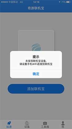 2、奇游会员账号登录成功后,在加速主界面点击“添加联机宝”按钮,此时系统会自动弹出提示框:“未发现联机宝设备,请设置手机WIFI连接到联机宝”。