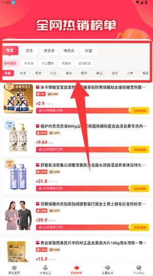 2、进入热销榜单页,通过平台与分类标签筛选商品。