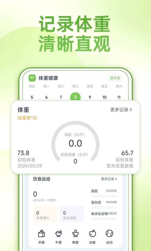 3、身体指标监测:提供身体指标监测功能,包括体重、BMI、体脂率等,帮助用户实时了解自己的身体状况和减肥进度。