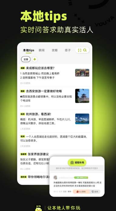 游鸭app是一个集广泛实用功能于一体的综合性旅游平台,用户可以在软件内体验当地特色,实时查看旅游指南和信息,在线结交同城朋友等,提供全新的旅行体验。专注于当地旅游建议和视觉地图攻关,融合年轻人旅行社交分享功能,为用户提供真实实用的旅游信息,打造贴近当地生活的特色旅程。实时获取最新的本地旅游提示、信息和季节性风景。