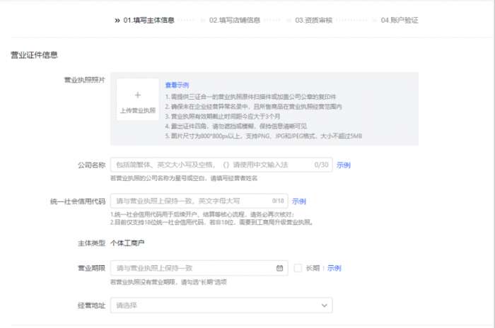 2、选择店铺类型我们准备的是个体营业执照,直接选择个体工商局就可以。至于为什么不让你们选择个人店,企业店。主要是因为个人店限制太多,没有发展空间,企业店操作过于繁多,需要走对公账户,缴纳税务。最主要的是缴纳的保证金会比个体店的贵一倍。但是这两种店铺类型在流量和权重上又没有明显的差别。三种店铺类型经过反复的对比,发现还是个体店更适合新手商家。