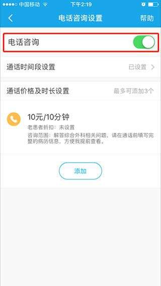 3、打开“电话咨询”开关,启动电话咨询服务。