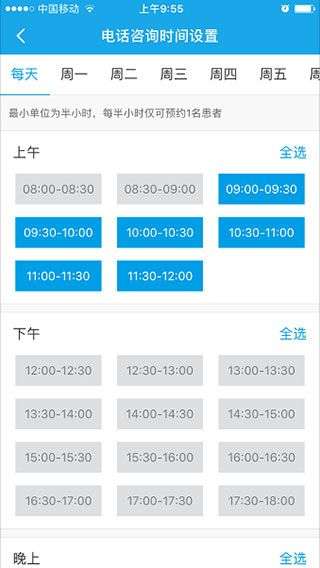 4、点击“通话时间段设置”,设置一个方便的接听电话时间,这样患者只能在设定的空闲时间咨询健康问题。