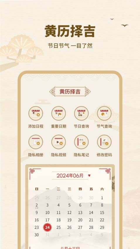黄历择吉是一款非常简单的黄历软件,拥有简单直观的界面设计,用户可以轻松选择各种日历模式,随时随地自由浏览各种信息,还提供经典的日历信息,让用户在网上对最新日期全面深入的了解,更好地掌握二十四节气的内容,轻松了解历史上的今天,能完全满足所有使用需求,还为用户提供了全面的旧历信息,方便用户在线选择旧历的吉凶方面,给用户带来精准的日历查询服务,有需要的用户欢迎下载软件吧。