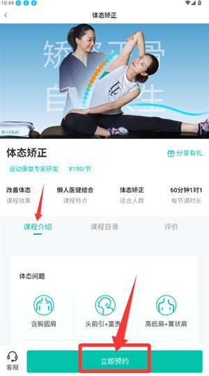 3、从列表中选择姿势矫正类,并在详细信息页面底部完成预约。