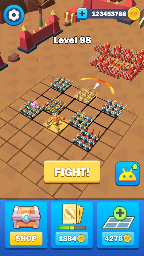 3、每次击败敌人,都能收获敌方的军团,升级你的武力值,自由的搭配竞技。