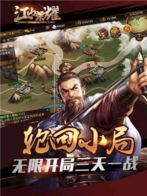 这是一个烽烟四起的年代,天下大乱,狼烟遍地;这是一个上兵伐谋的世界,神机妙算,决胜千里;这也是一个名将辈出的年代,能人异士,层出不穷。如果让你重回三国时代,你是否能像那些英雄一样,招兵买马,纵横捭阖,在乱世中建立自己的一方势力,然后与群雄逐鹿中原,打下那座代表着至高荣耀的江山!《江山荣耀》是一款三国题材的小局制SLG手游,在游戏中,玩家将会扮演一方诸侯,招兵买马,建造城池,发展势力,向一统天下的目标前进!