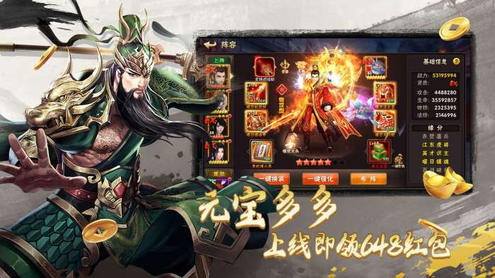 玩家可以为上阵的英雄装备强力的武器、防具、宝物、圣器、神兵、宠物,玩家可以使用征战中获得的材料持续锻造装备获得更高属性,同时玩家还可以根据需要为装备镶嵌宝石或重铸装备,多样的装备极大的丰富了游戏的策略性。武将缘分装备还可以大幅加强技能、属性,打造你的超强本命。