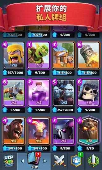 ● 和《Clash Royale》家族一起研究配置并升级你收藏的卡片,其中包含多种你喜爱的《部落衝突》部队、法术以及防御设施