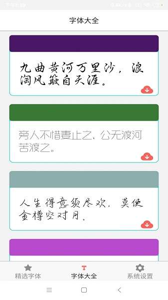 字体库大全是一款字体资源丰富的实用软件,收录了海量精美字体,用户可以自由挑选并应用在手机或设计中,操作简单,功能强大,不仅能轻松更换字体,还支持自定义打造专属风格,让你的手机界面或作品更独特,都能轻松满足,提供多种风格字体下载与使用,用户可根据需求挑选字体,并支持调整字体大小,打造更契合手机或个人喜好的展示效果,软件字体种类丰富、样式好看,使用便捷,是提升手机美感与创作体验的绝佳工具。