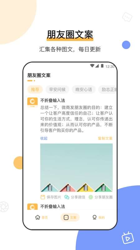 不折叠输入法微商专用是一款全新的微商输入法软件,拥有丰富多样的微商输入话术,可以让用户自由选择查看,轻松在线复制来打字聊天,还集合了全新的功能和选择,允许用户轻松选择各种输入法模式,随时随地自由输入拼音来选择话术,能完全满足所有书源需求,还具有简洁的界面设计,无需任何经验即可上手使用,随时随地查看最新的拼音汉字数据库,给用户带来非常方便的使用过程,有需求的用户欢迎下载软件吧。