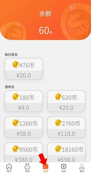 2、进入首页后点击下方充值界面可充值相应数量的货币。