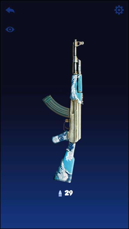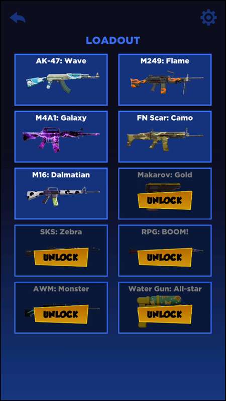 1、打开游戏,我们能够选择自己喜欢的枪械开始游戏,第一次游玩的时候,需要点击右上角的齿轮。
