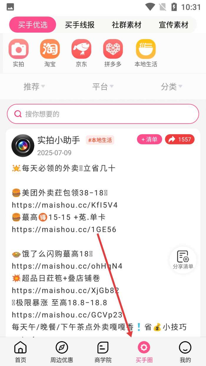 3、从首页进入买手圈,能看到买手优选、线报等内容,有外卖优惠券领取等实用信息,方便用户省钱。