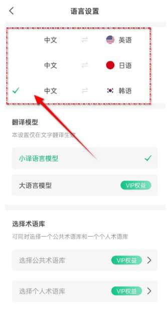 3、根据需要勾选“中英”、“中日”或“中韩”互译即可。
