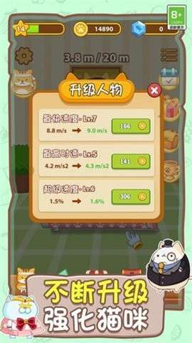 1.q版喵喵主题:游戏以q版喵喵为主题。可爱的喵喵形象加上惊险有趣的跑酷玩法,让玩家欲罢不能;
