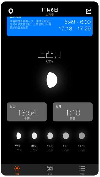 日出月落可以智能计算日出日落时间、布鲁斯时间、月亮等,让相关摄影爱好者可以方便地选择合适的时间拍照;通过进度条的形式显示日出时间、日落时间、实时时间、黄金时间等,用不同的颜色标记相应,也可以查询出月落时间,了解未来几天上凸月的出现时间;日历上显示了月亮的变化。形状不同。选择日期可以看到具体的变化时间。 还可以切换到时间模式,详细显示日出和日落的时间。用户在查看数据信息后,可以一键创建成长图模式,方便地分享给朋友,朋友也可以知道具体的时间信息。