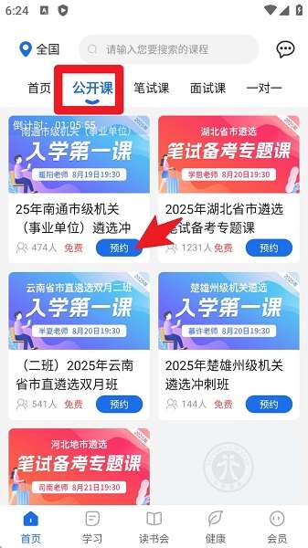 3、在顶部导航栏选择「公开课」,可浏览各类免费课程,点击具体课程下的「预约」按钮即可报名参加直播。