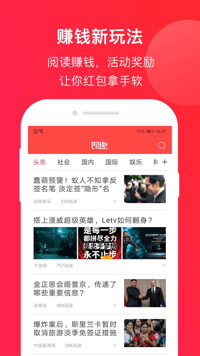 即趣是一款能够让用户在无聊的时间在线阅读各种各样的新闻资讯,无论你是喜欢阅读一些社会资讯,还是财经欣慰,甚至是娱乐八卦都能够在线进行阅读,在满足用户阅读需求的同时,还能够在线进行赚钱,让用户轻轻松松就能够在线赚到零花钱的手机新闻资讯类应用软件。用户通过这款软件,不仅可以在线浏览各种类型的新闻资讯,让用户随时随地都能够在线读取自己需要的新闻资讯,而且用户在阅读相关资讯的同时,直接就能够进行赚钱。另外,用户还可以在线上观看各种精彩的短视频内容,帮助用户在线打发掉无聊的时间,让用户一整天都充满乐趣,享受不一样的阅读乐趣。