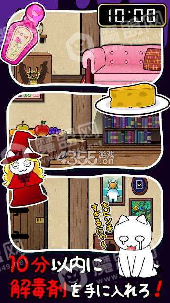 再10分钟就死定了是一款日系的白猫系列的冒险解谜手游,游戏中玩家扮演一只可爱的白猫,某一日你误食了一只女巫的毒苹果,十分钟后你将死亡!为了活下去,一定要竭尽全力找到解药!在这有限的10分钟之内!时间紧迫,容不得耽误了!
