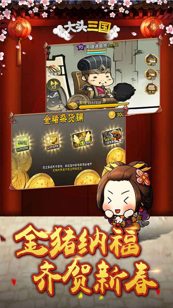 大头三国是一款非常好玩的策略三国游戏,游戏为大头Q版风格,人物角色刻画的较为有特点吗,玩法多样化,超多的副本等你来刷,强力的武将等你培养,一起征战沙场喜,欢这款游戏的小伙伴快来下载试试吧!