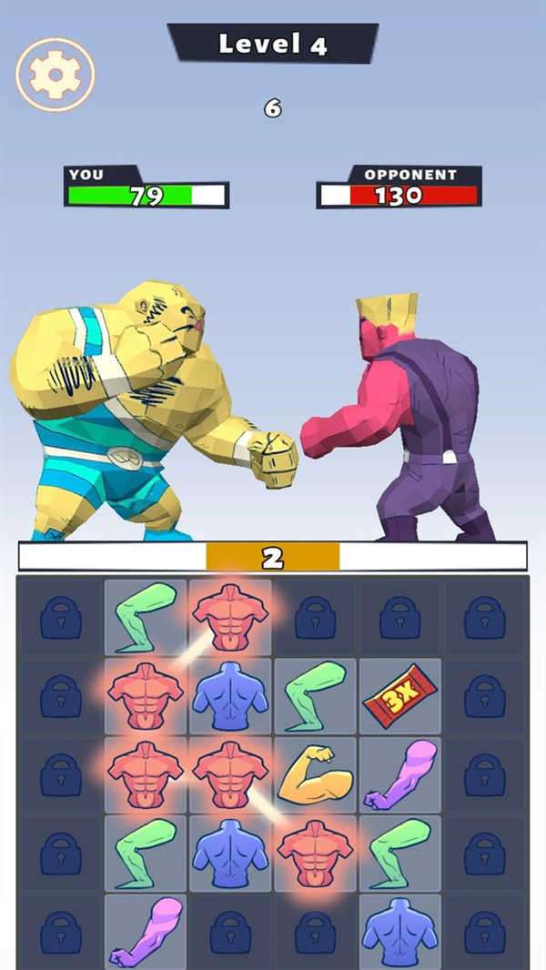 通过手指将两个或两个以上相同的肌肉滑动匹配即可攻击对方。