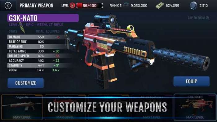 3.选择最满意的武器后,可以修改瞄准具、消音器、握把、枪管、枪托等影响武器性能的重要部件。