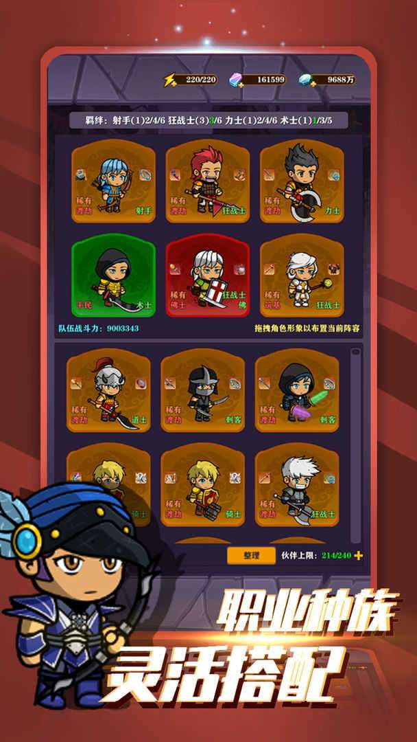 战士、法师、医师、刺客、刀客、剑客、道士等十多种职业。多个相同职业角色上阵可触发职业技能,角色数量越多,职业技能等级越高。
