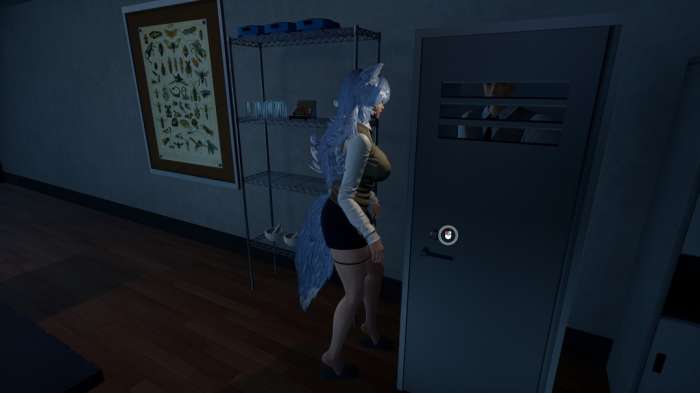 随指引取得卡片,前往保安室输入密码得到正门钥匙,开启上锁大门,狼嚎响起后触发首段结局动画:芙蕾雅破窗而出,将男主推倒。