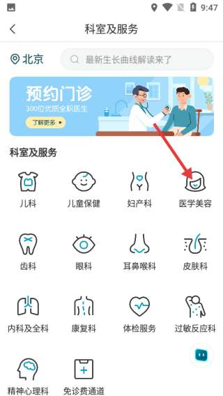 2、在科室和服务页面,选择“医学美学”科室,进入医学美学服务详情页面。