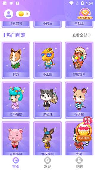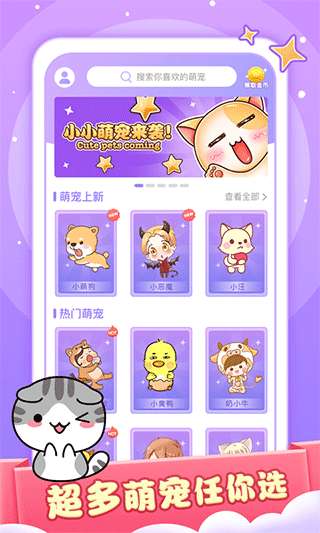 1、打开在本站下载安装的小小桌宠app后,进入首页选择你喜欢的萌宠角色,这里有不同种类的萌宠;