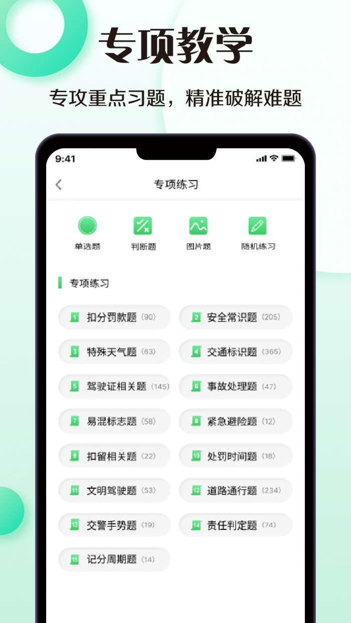 1、专业练习:按照一定的规则对题库进行分类和汇总,方便用户练习。