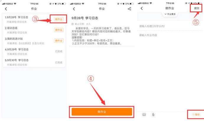 首页→学习进度→面授→作业→点击要完成的作业→输入标题+内容,点击提交即可。(作业未完成可点击暂存)