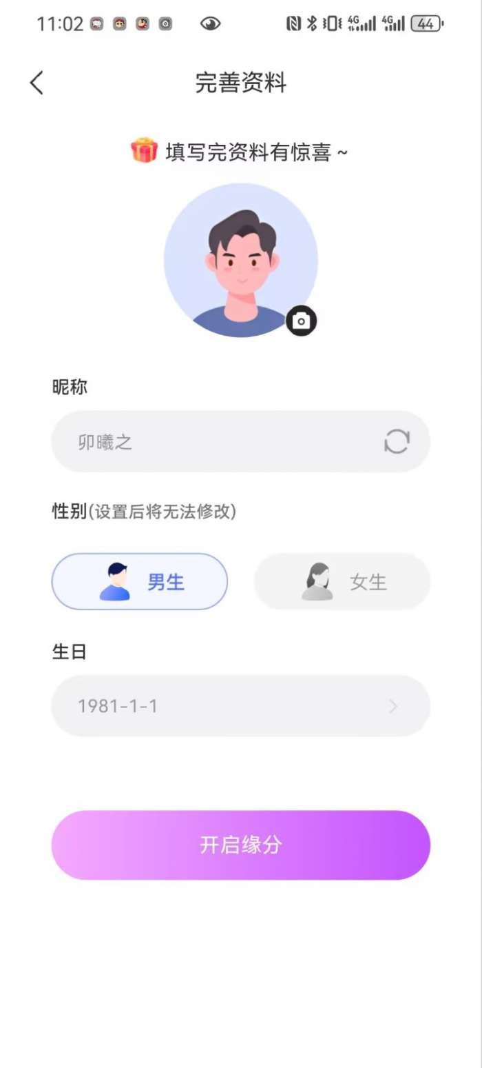 3、根据平台需求填写用户的个人资料然后点击开始缘分。