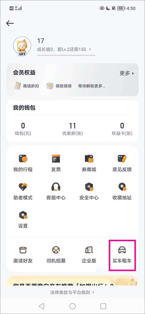 2、在个人中心界面找到并点击“买车、租车”选项。