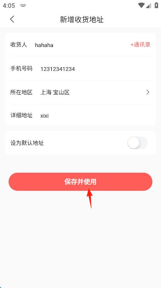 7、填写详细的收货地址后,点击屏幕底部的“保存并使用”。