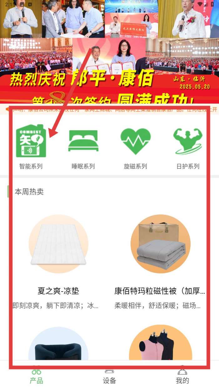 2、在智能系列产品列表,选择目标产品,如康佰智能床,点击进入该产品详情页面。