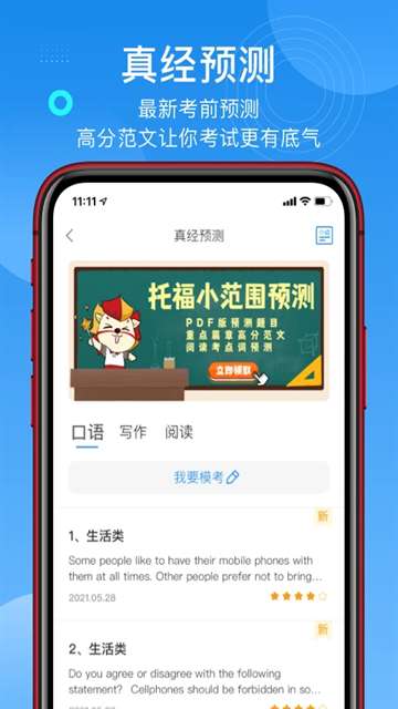 1、真正的经典预测:基于过去五年数千套考试记忆的大数据,每月更新英语口语、写作和阅读的高频预测问题,以准确识别关键点。