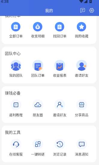 5、之后在“我的”功能菜单界面找到“赚钱必备”模块下面的“返利教程”按钮点击进入。